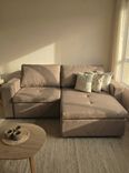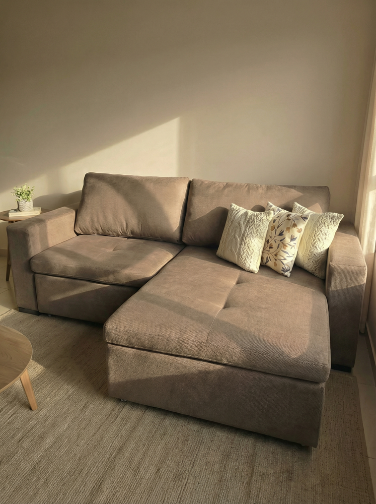 Sofá con chaise pensado para disfrutar momentos de descanso con total comodidad. Su diseño sencillo y equilibrado transmite calidez, mientras que los asientos amplios y el respaldo suave invitan a relajarse desde el primer instante.