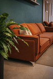 Modelo de 3 plazas con chaise y acabado en costura expuesta. Incluye respaldos sueltos y asientos de alta densidad. Una propuesta de diseño minimalista que optimiza el área de descanso sin sobrecargar visualmente el entorno.