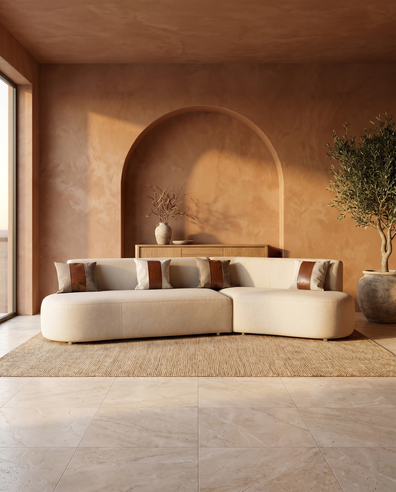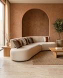Diseñado para espacios que respiran, este seccional curvo reemplaza los ángulos rectos por una silueta fluida que se adapta al movimiento natural del ambiente. Su tapizado crema de tacto suave aporta calidez sin peso visual.