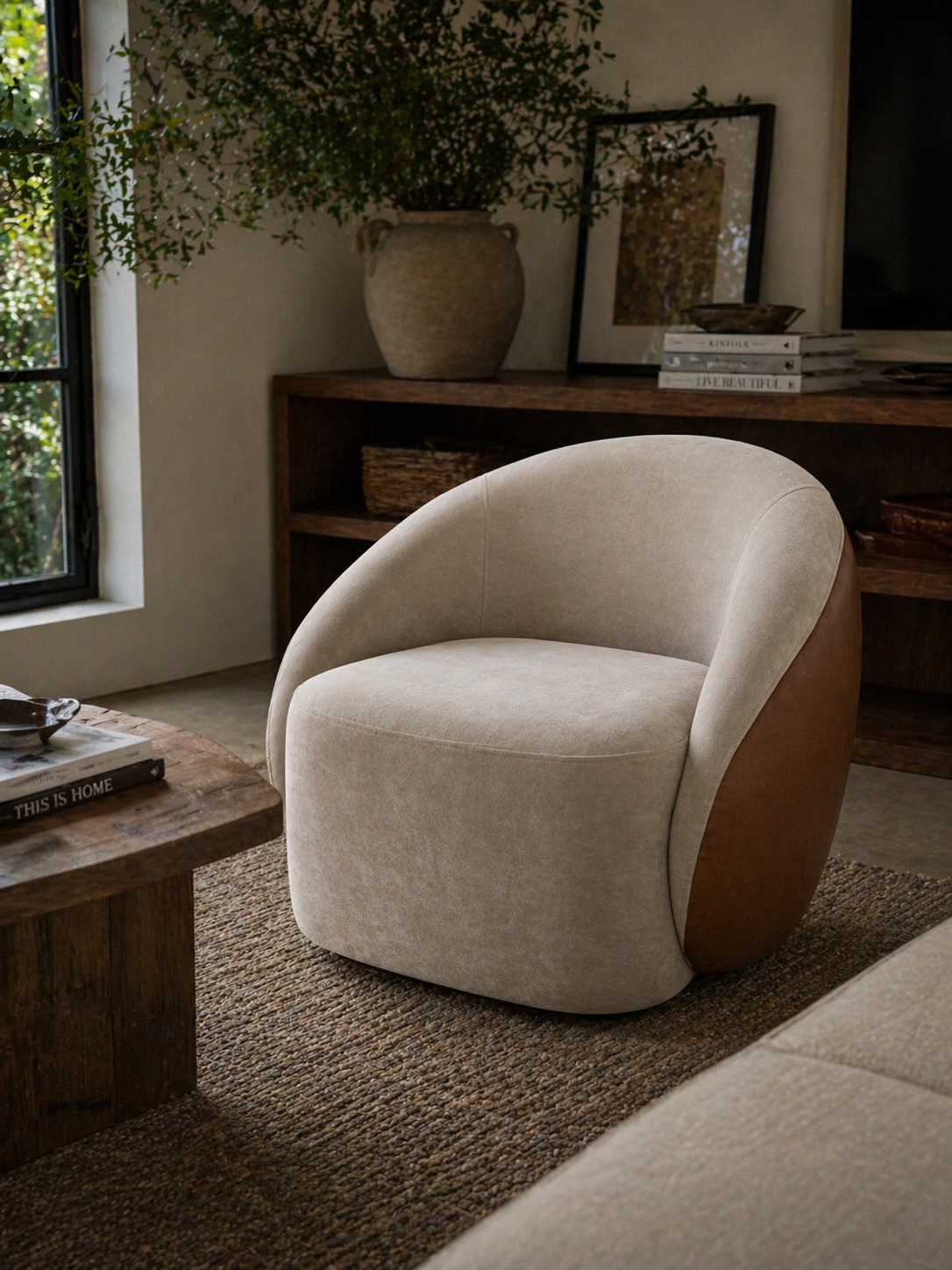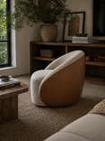 Esta poltrona combina una silueta curva con un tejido lino, creando el rincón perfecto para tus momentos de lectura o café. Su diseño circular aporta una fluidez única que suaviza cualquier rincón de tu hogar.
